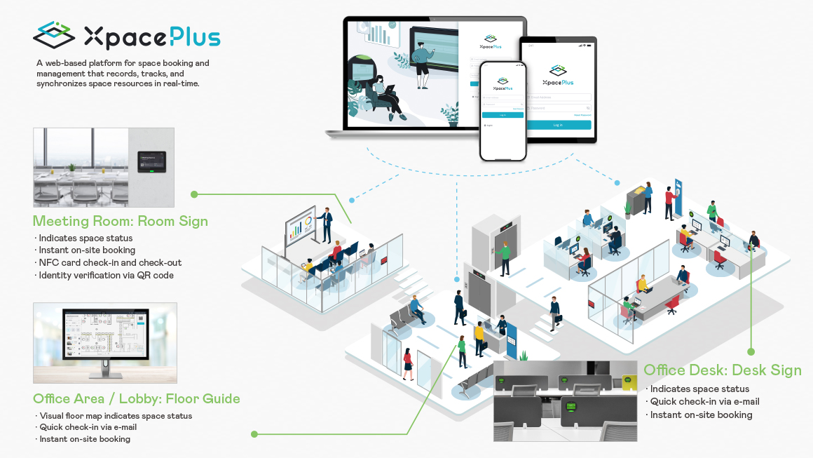 The AUO Display Plus Meeting Space Management Solution is a comprehensive solution designed to make booking and management of meeting rooms and office spaces easier than ever. This solution includes the XpacePlus platform, interactive floor guide, room and desk signs, users and facility managers can enjoy smarter space reservation and management processes with reduced administration time and associated costs.